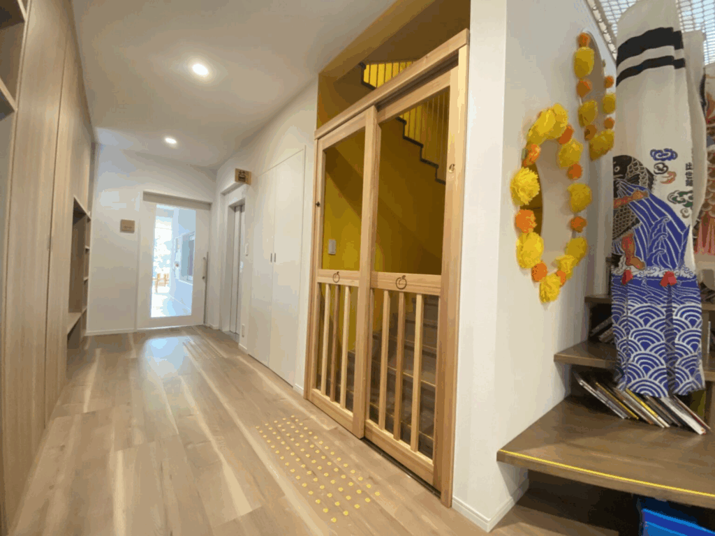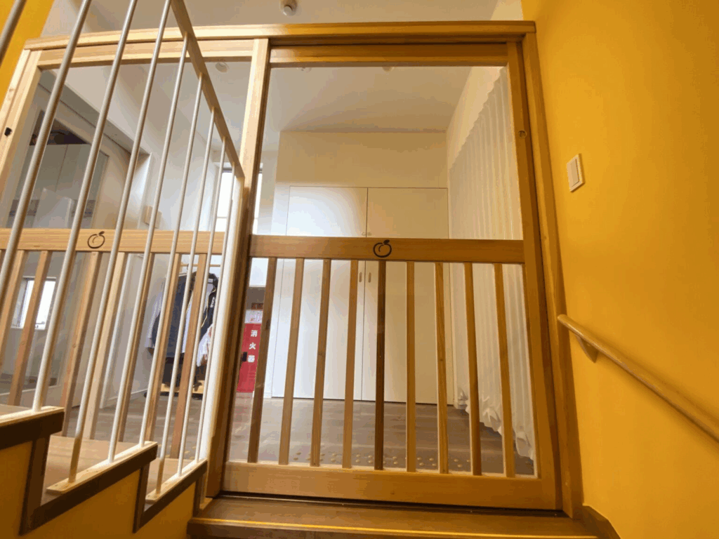 アプリコット倶楽部様の保育園に設置された階段前の木製セーフティゲート。
