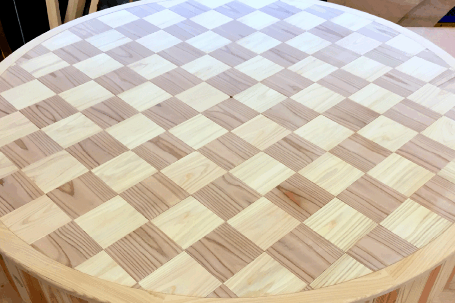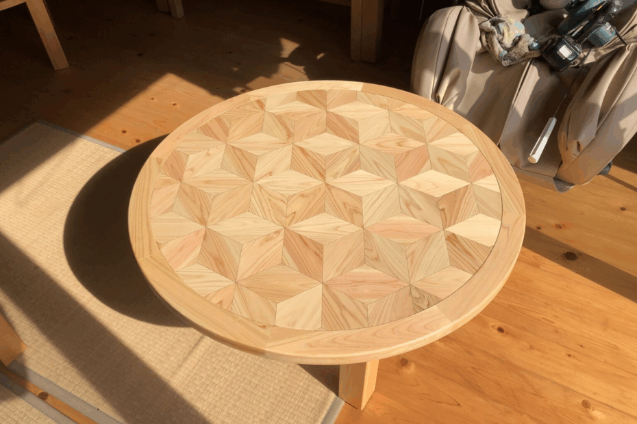 天板に立体的な四角形模様を描いた、寄木細工風の丸テーブル。異なる木目や色味を組み合わせ、光の当たり方によって模様が浮き上がるように見えるデザインです。 多摩産材を使用し、丁寧に削り合わせて組み上げた手仕事の一品。自然の木… 製作事例|寄木細工風 立体模様の丸テーブル