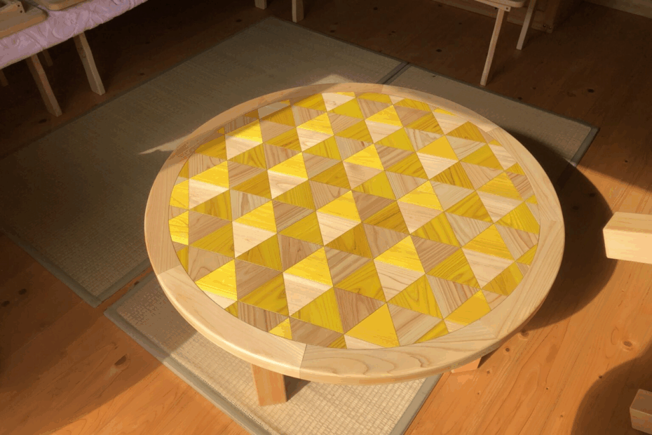 幾何学模様の天板に、やわらかな黄色のアクセントを加えた丸テーブル。 自然木の木目と色のコントラストが、明るく軽やかな印象を生み出しています。 木の質感を損なわない自然系塗料で着色し、手ざわりはそのままに。保育施設や集いの… 製作事例|彩り寄木の丸テーブル(黄)