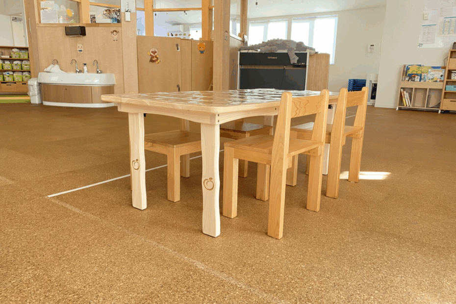 アプリコット倶楽部様の保育園向けに製作した学習机。多摩産材を使用し、木の香りとぬくもりが感じられるやさしいデザインに仕上げました。 机の脚には園名にちなんだアプリコットのロゴを刻印し、温かみのある空間演出にも貢献。角部は… 製作事例|ロゴ入り保育園用勉強机