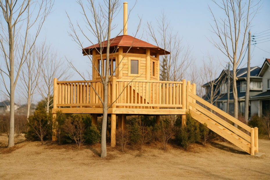 やさしい木の香りと温もりが園庭全体に広がり、子どもたちが自然とふれあいながら遊べる空間をつくり出しています。 天然木の丸みや風合いを生かしながら、安全性と耐久性を兼ね備えた設計。階段や手すりには滑らかな手ざわりを持たせ、… 製作事例|園庭遊具「ツリーハウス」|Tokyo夢工房の木製遊具