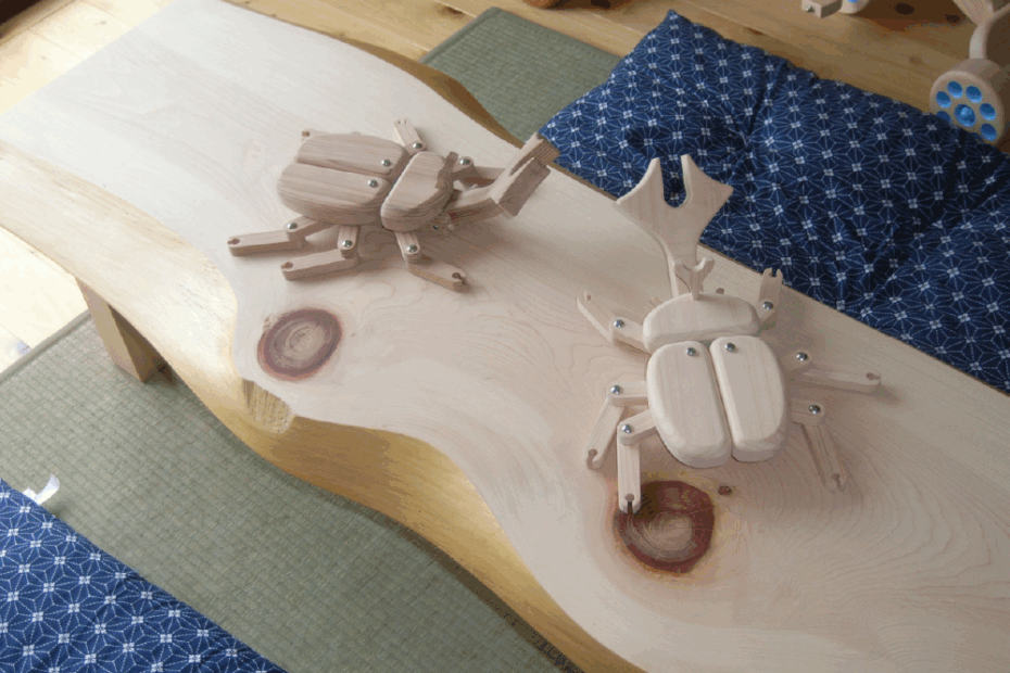 手づくりの木製かぶとむし。 節や木目の表情をそのまま残し、やさしい手ざわりと香りを楽しめるよう仕上げています。金属パーツで関節を動かすことができ、遊びながら木のぬくもりを感じられるおもちゃです。 職人が一体ずつ削り出し、… 製作事例|木製おもちゃのかぶとむ・知育玩具